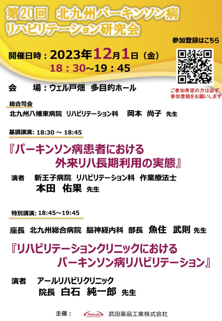 2023年12月1日(金) 18:30〜19:45 の日時で、ウェル戸畑多目的ホールにて第20回北九州パーキンソン病リハビリテーション研究会が開催されます。